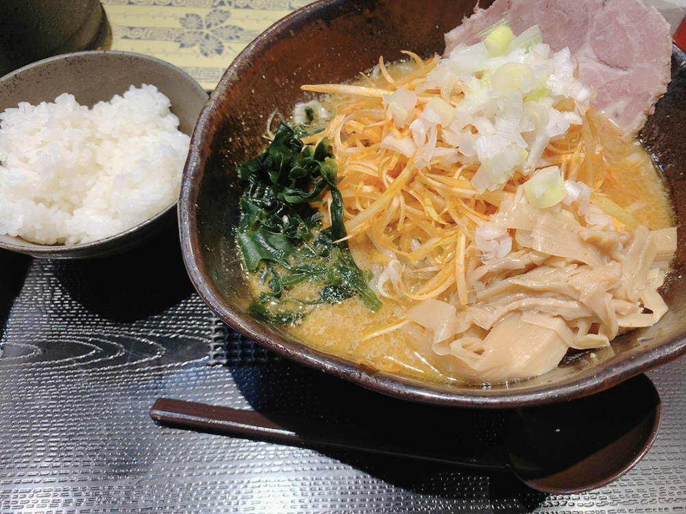 ピリ辛ネギが乗った味噌ラーメンをオーダー。ライスがサービスで付いてきました。