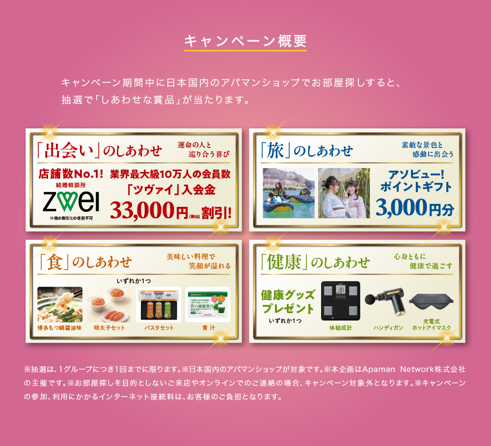 アパマンショップ 『しあわせキャンペーン』開催中 来店・オンライン接客で当たる!2025-01-24