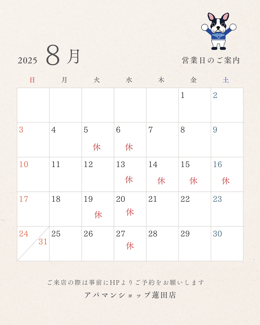 8月の営業日のご案内 ~アパマンショップ蓮田店便り~2025-08-04