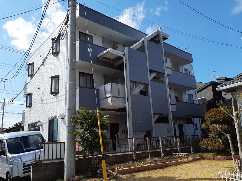 以前は茶色中心の外壁で塗装をおこなっておりました。年数と共に錆、チョーキング、紫外線のよる色褪せが目立つようになり、オーナー様へご提案し、建物の外壁塗装をさせて頂く事になりました。白や黒(グレー)を基調としたカラーに仕上げ、建物の雰囲気が大分変りました。