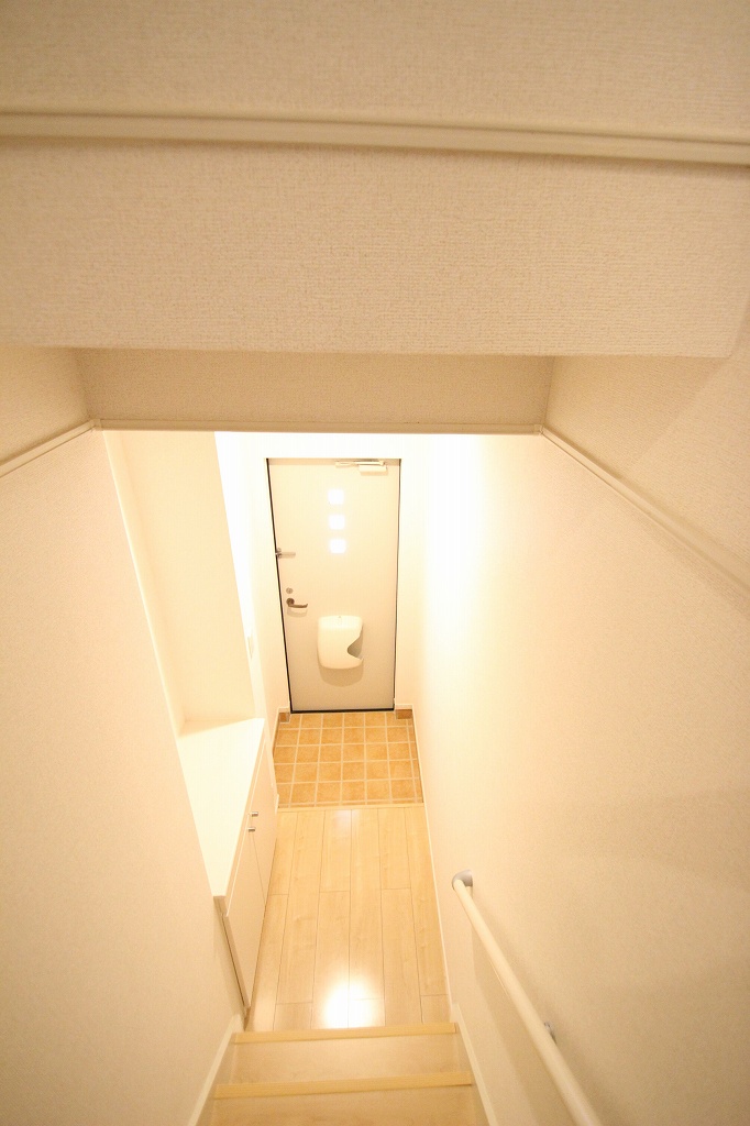 こちらのお部屋は2階のお部屋なのでまず玄関を開けると階段がございます!
