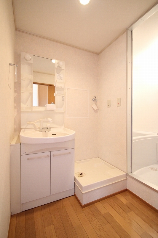 洗面台はシャワー付き、お風呂は追焚き機能付きです