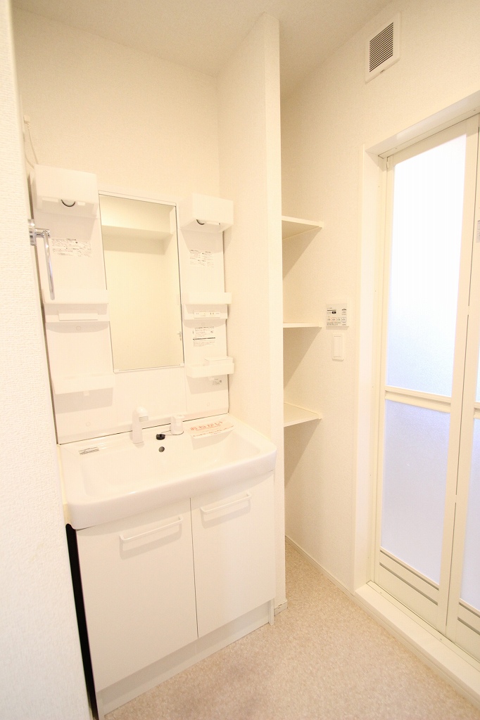 横の収納スペースもあったら嬉しいですよね。自分だったらドライヤーや整髪料など置きますね。