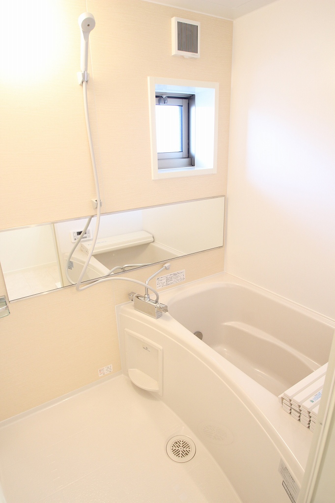 浴室は広い鏡にサーモスタット混合栓が付いております
