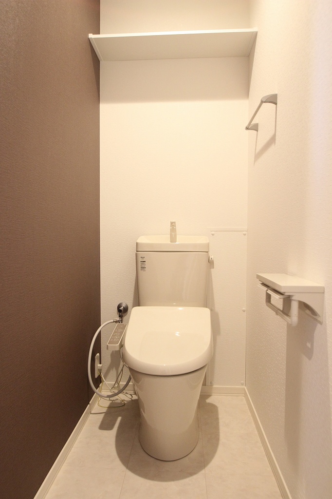 お手洗いもウォシュレットはもちろんのことタオル掛けや収納棚など使いやすさ抜群です