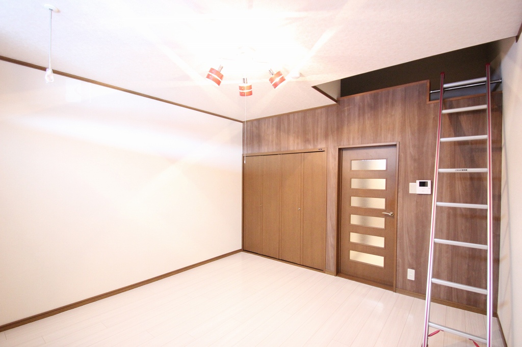 ウッド調のアクセントクロスとダウンライトが良い感じです