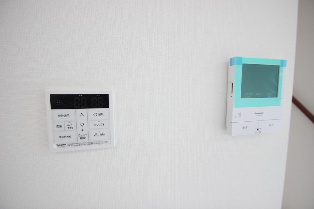 リビングの壁面に給湯器のパネルと警備の切り替えなどの機能ついたモニターホンがあります