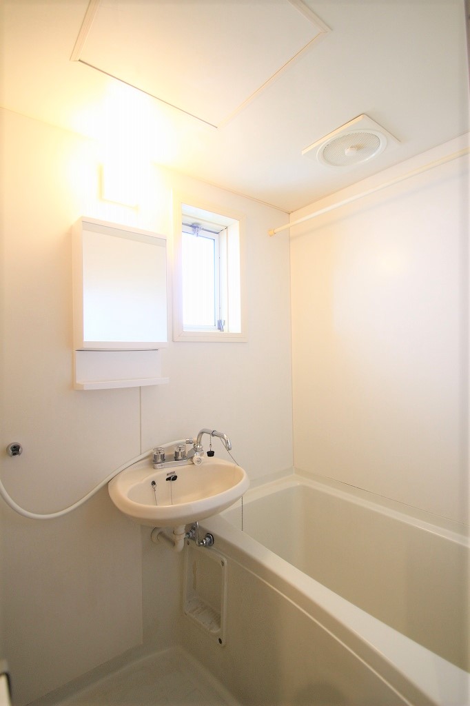 お風呂は洗面所とセットのタイプですが、歯ブラシなどの収納付きの収納部もあり、扱いやすそうですね