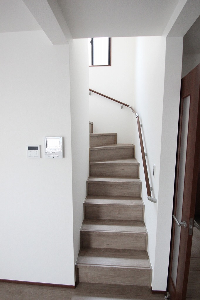 二階へ続く階段はリビングにあり、幅も広く手すりなどもついているので安心ですね