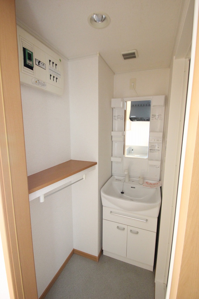 洗面所には洗髪洗面台と物を置くことのできる棚がございます!