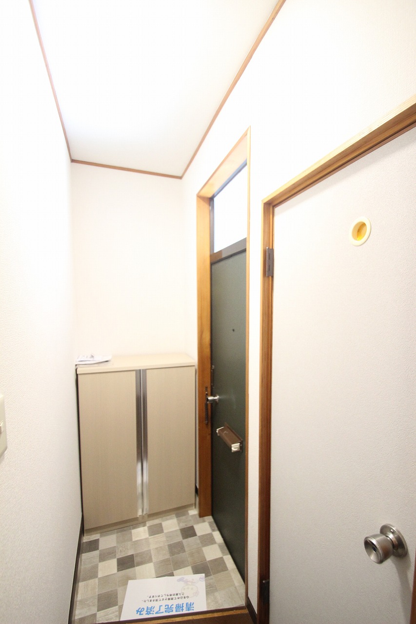 新しいシューズボックスを設置して、土間部分のクロスをかわいいものに張り替えました♪