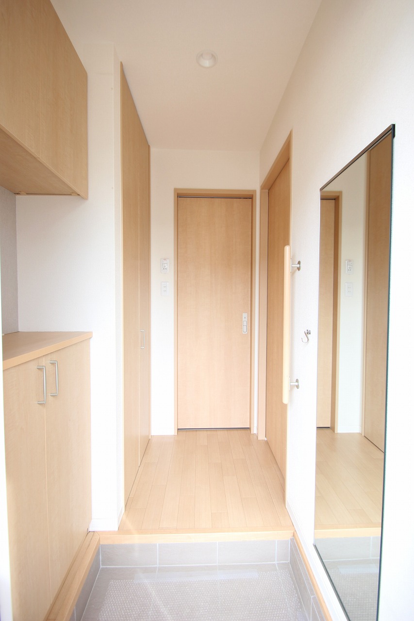 シューズボックスは上下で分かれているタイプのもので姿見の鏡が付いているので