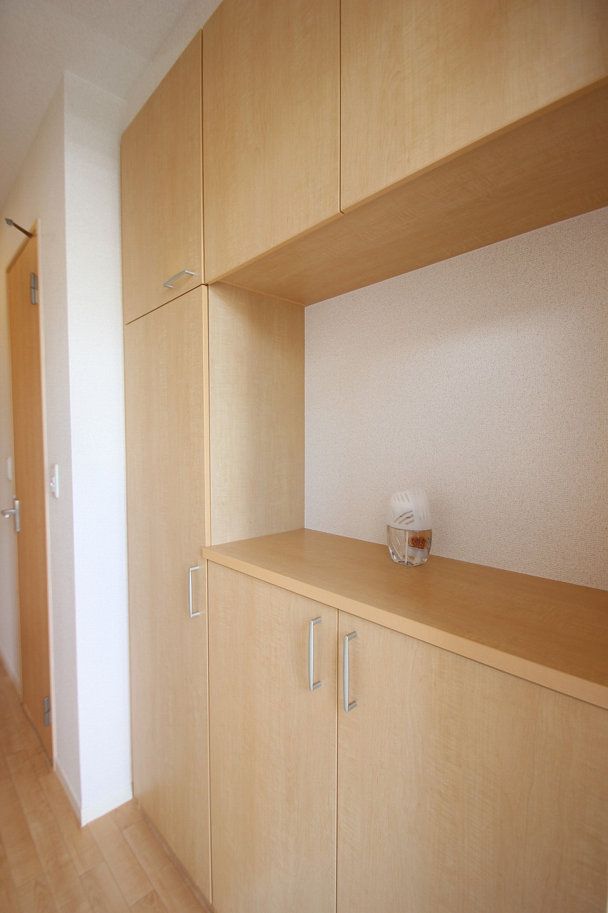 玄関を開けるとまず目につくのは上下と横に連なっているシューズボックスですね