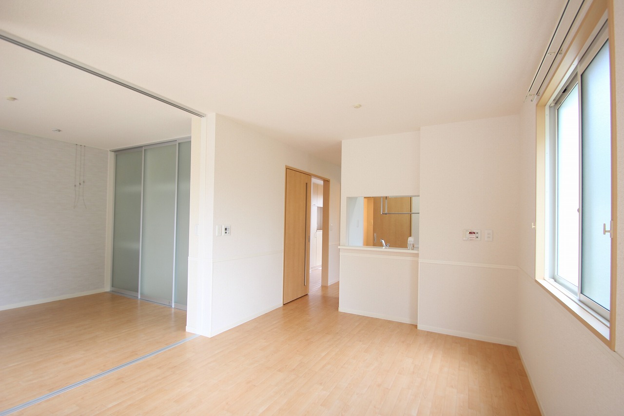お部屋はこんな感じでカウンターキッチンに加え、洋室との境は写真の通り、分けることができるので大きい一部屋として使うこともできます