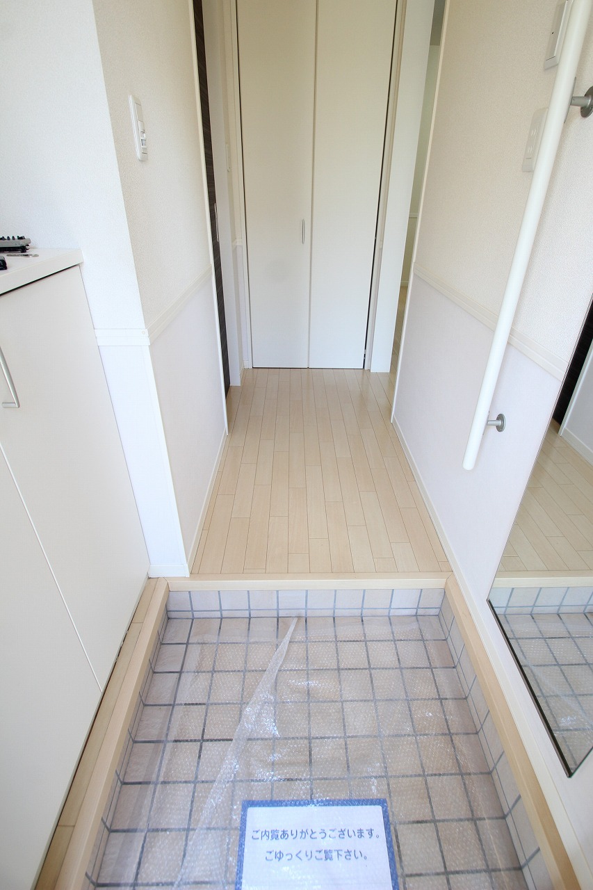 玄関扉を開けるとこじんまりとはしてますがシューズBOXや姿見鏡など便利な設備がいっぱいありますね