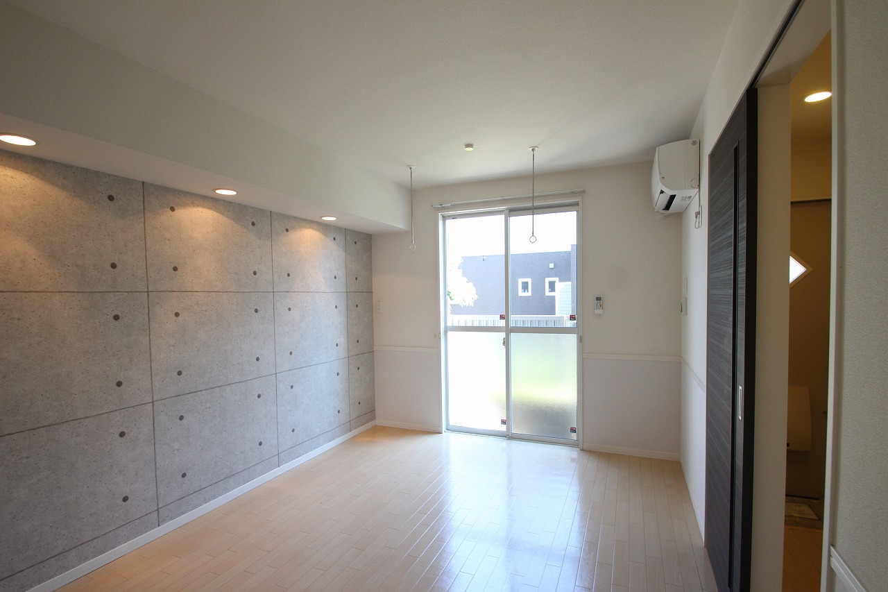 リビングはアクセントクロスにコンクリート打ちっぱなしのような見た目のクロスが使われております!