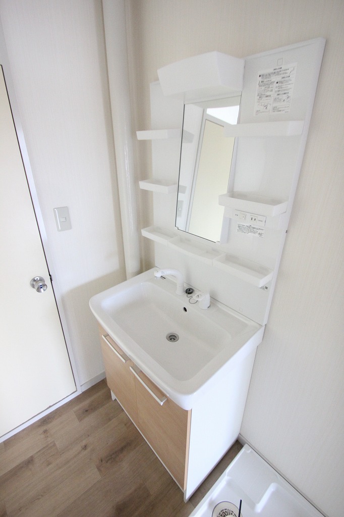 洗面台は新しいものが付いており、ものを置いておくスペースに加えて、