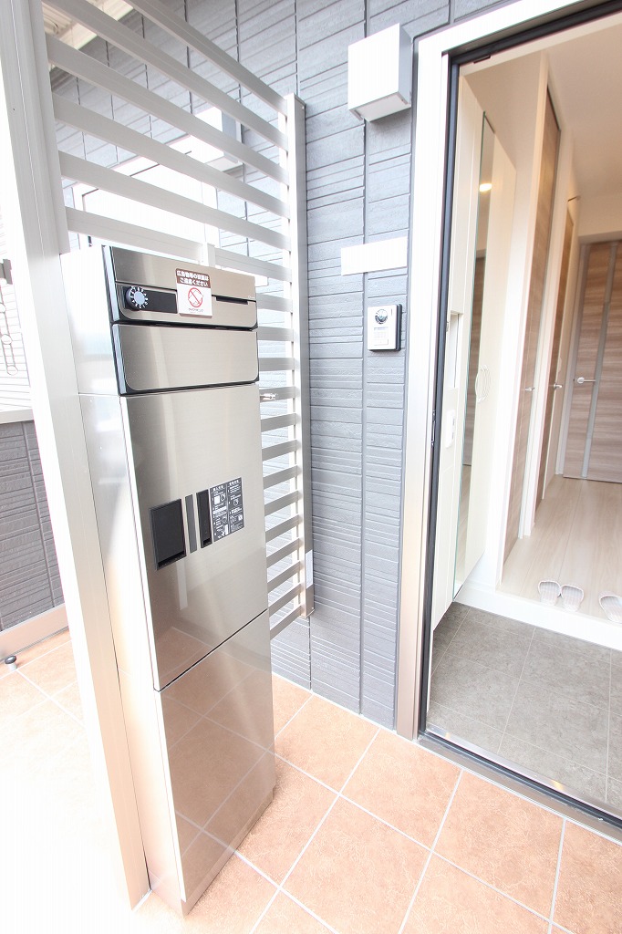 まず目につくポイントは、玄関前にある各世帯ごとの専用のナンバーロック付きの郵便受けと、宅配BOXが完備されている点ですね