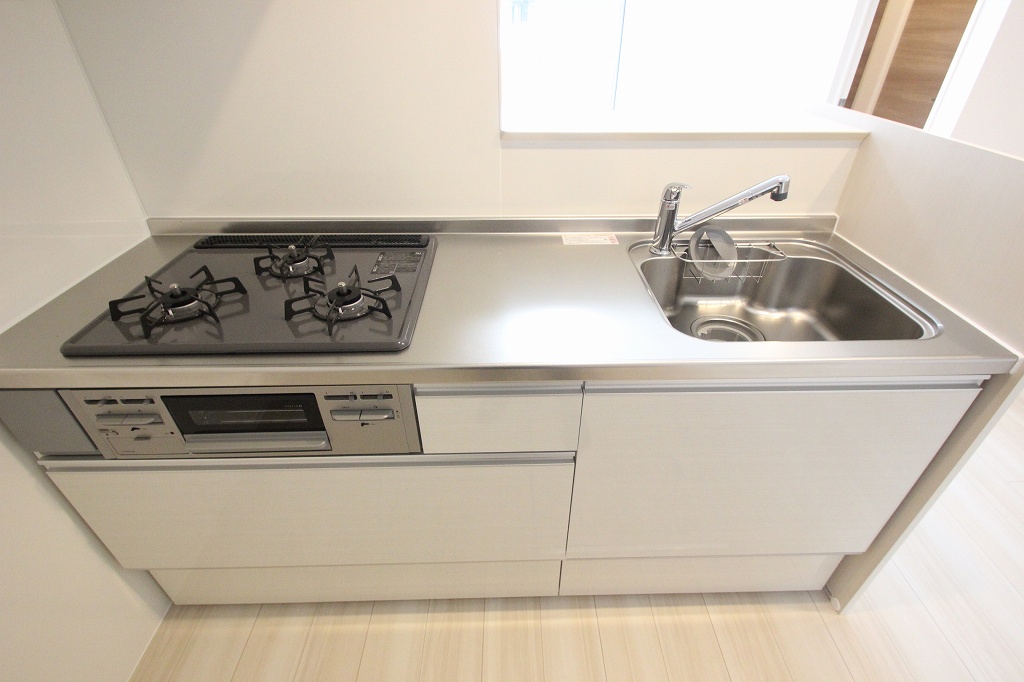 キッチンはこんな感じでガスコンロの三ツ口タイプです