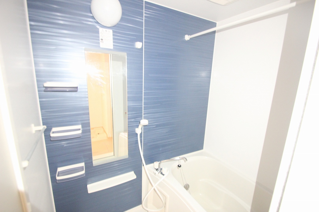 浴室には追い焚き機能や浴室乾燥機が付いており壁は青色でとってもおしゃれです。