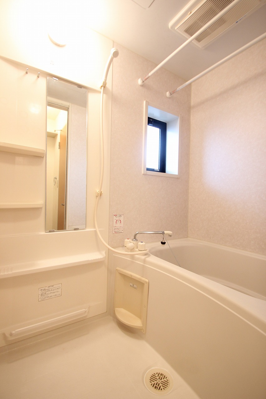 お風呂はこんな感じで物を置くスペースに加え、浴室乾燥用のポールも設備されております