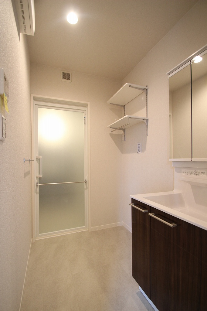 洗面所は広めの作りになっており、洗濯機上の物置スペースなども設備されております