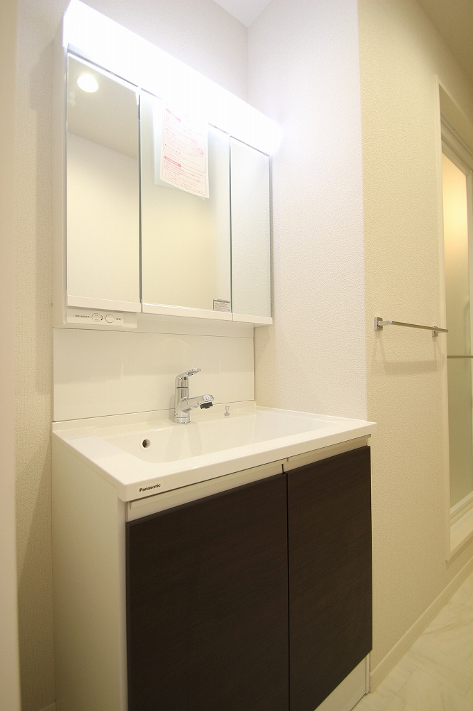 洗面台も三面鏡タイプのシャワードレッサーなので朝の忙しい時間にはもってこいの設備になっています