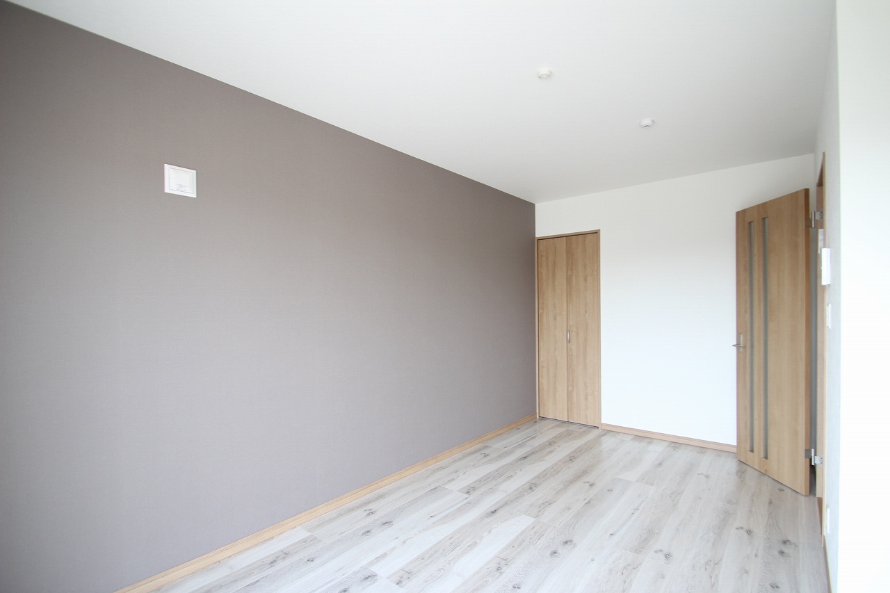 壁の一面がグレーのアクセントクロスになっています。