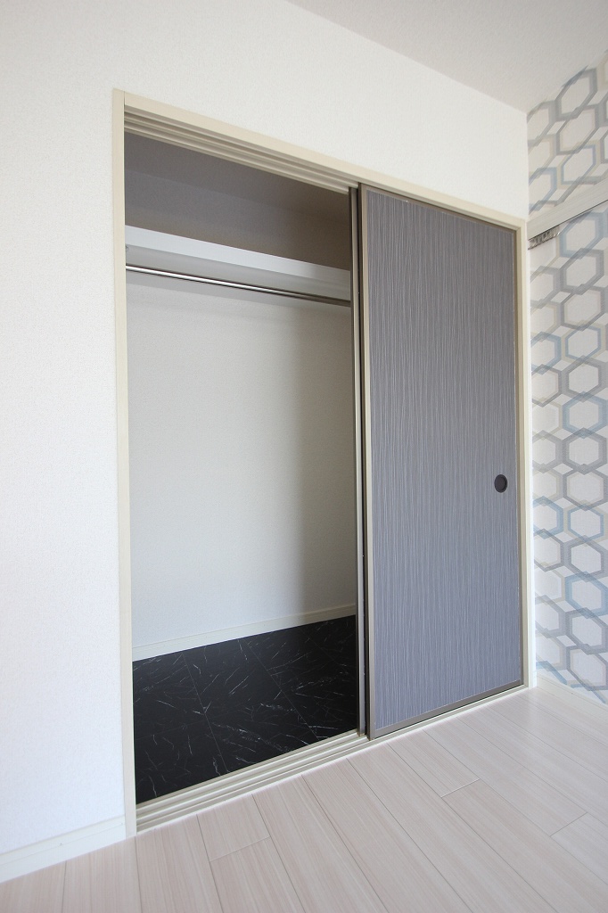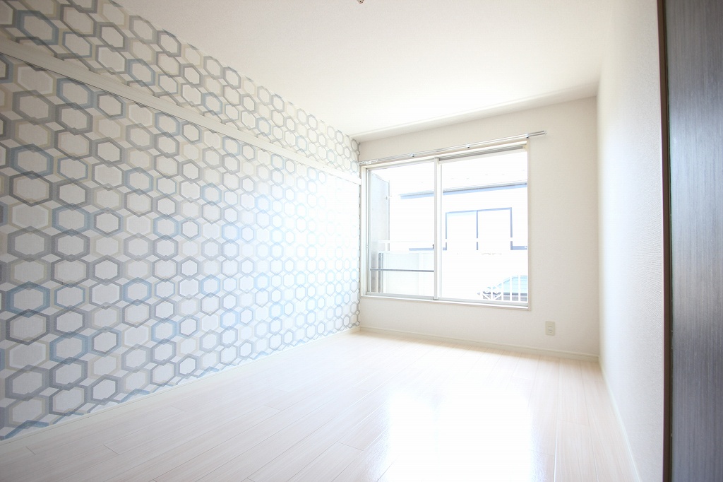 さっきのお部屋の隣は縦長で個性的なアクセントクロスが目立つお部屋になってます!