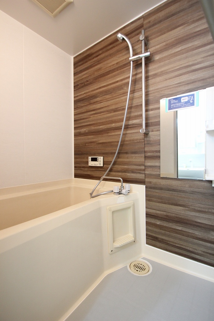 お風呂は一面がめっちゃおしゃれな木目のパネルが入っております!