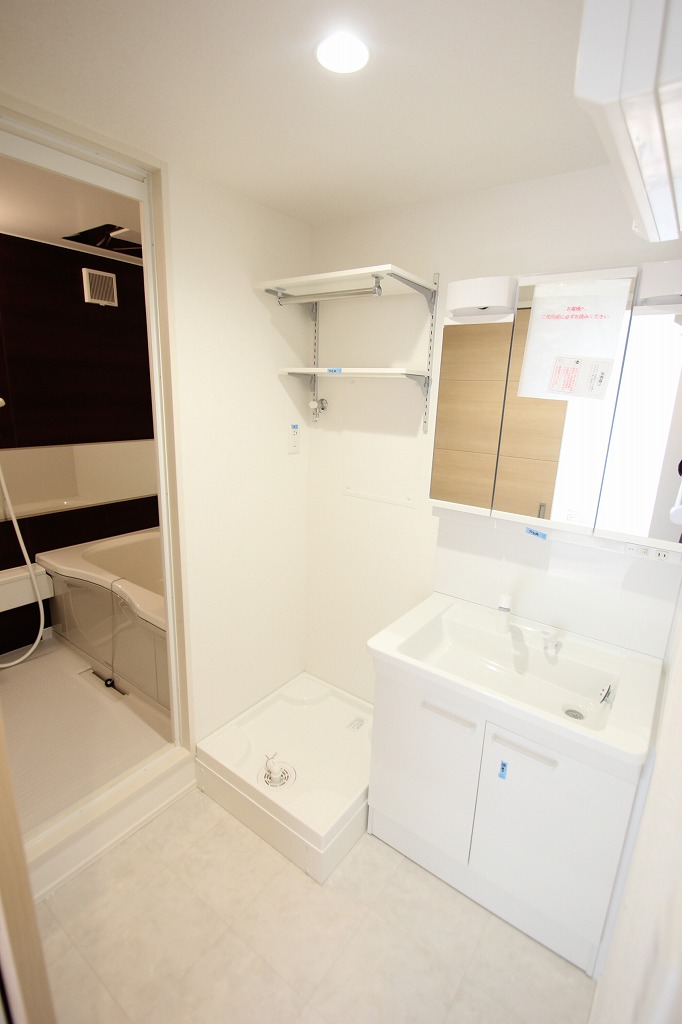 洗面台横の洗濯機置き場には設備で棚が付いているのでタオルや少量の備品はこちらで十分収納できますね