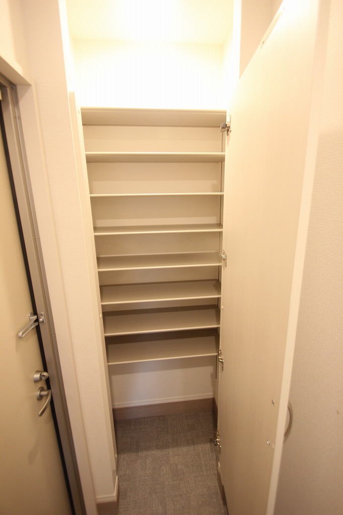 シューズボックスは扉が付いており、ライトもあるので収納力と入れられるものの幅が大分広いです