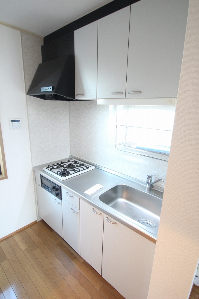 キッチンはこんな感じで調理スペースが大きい二口のシステムキッチンです