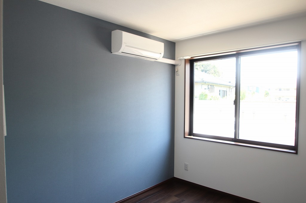 部屋はこんな感じで一面が紺色のアクセントクロスになっております