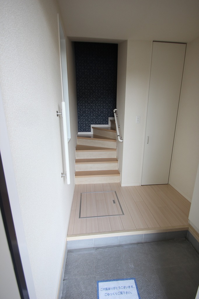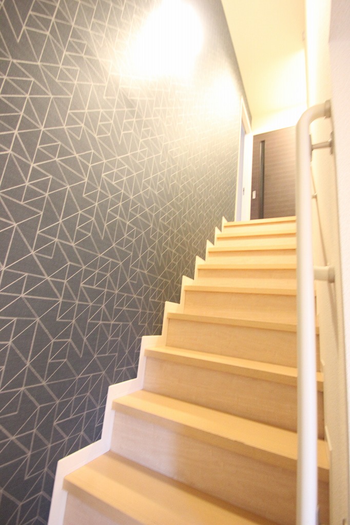 階段はこんな感じでアクセントクロスがおしゃれな雰囲気を醸し出しております