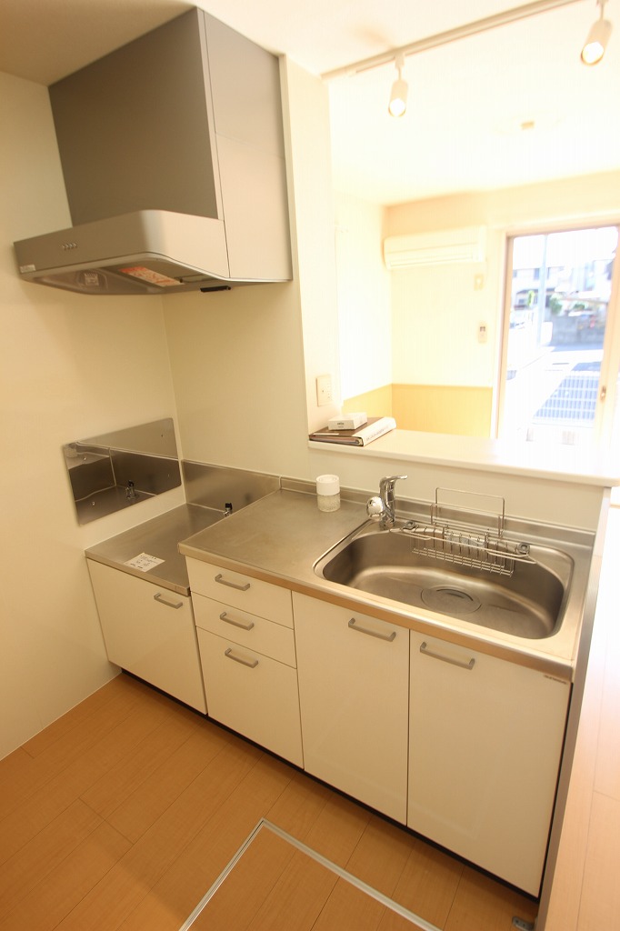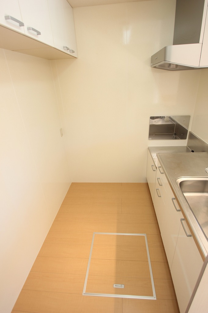 キッチンは幅が広く上部に収納も完備されている他、床下収納もございますので収納棚がなくとも割と十分な量のものがしまえそうです