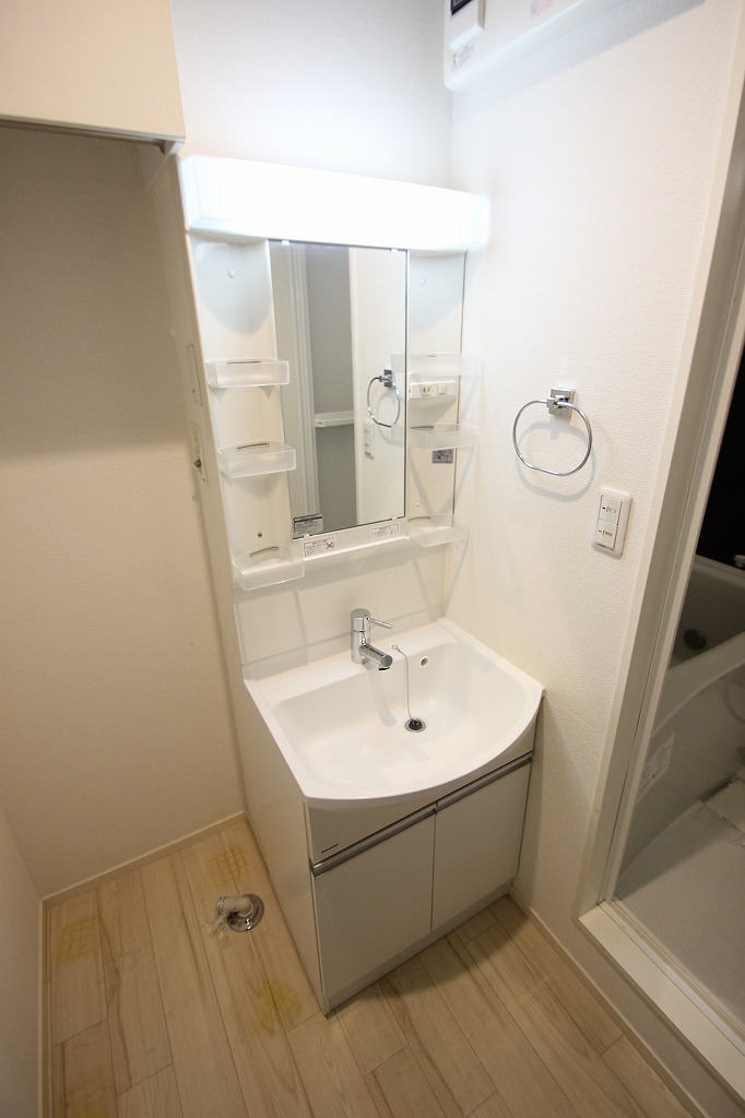 横の洗濯機置き場の上には備え付けの収納があり、個人的には結構おススメなポイントですよ