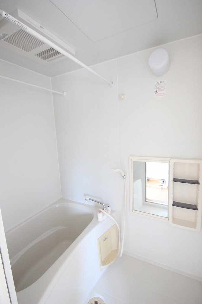 お風呂は浴室乾燥付きで鏡や収納棚もあります!