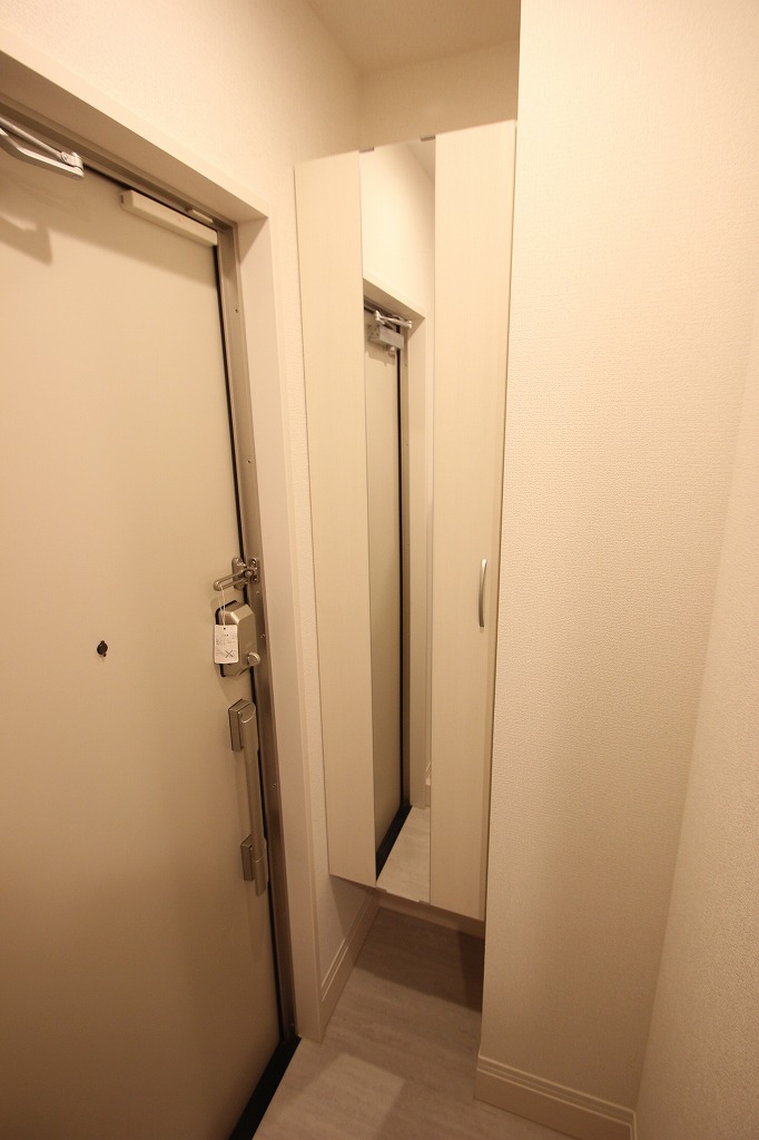 シューズボックスは姿見付きのタイプで忙しい朝のお出かけ前チェックに嬉しい仕様ですね