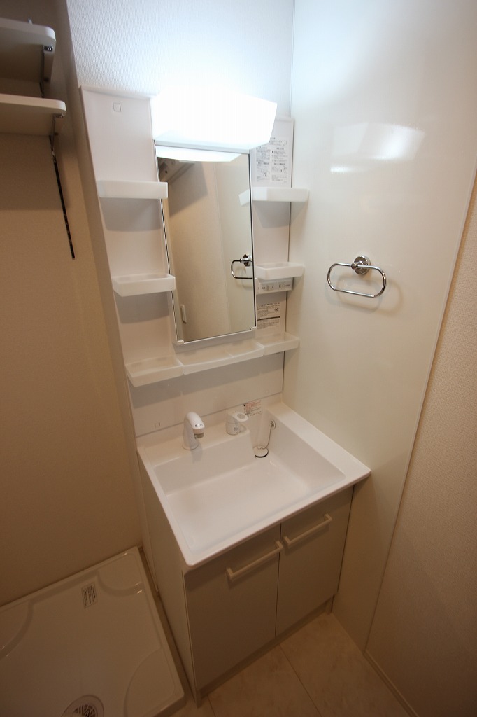 洗面所周りはこんな感じで際立って広いわけではございませんが、トイレ同様に収納棚がもともとあるので用意するものが少なくて済みそうですね