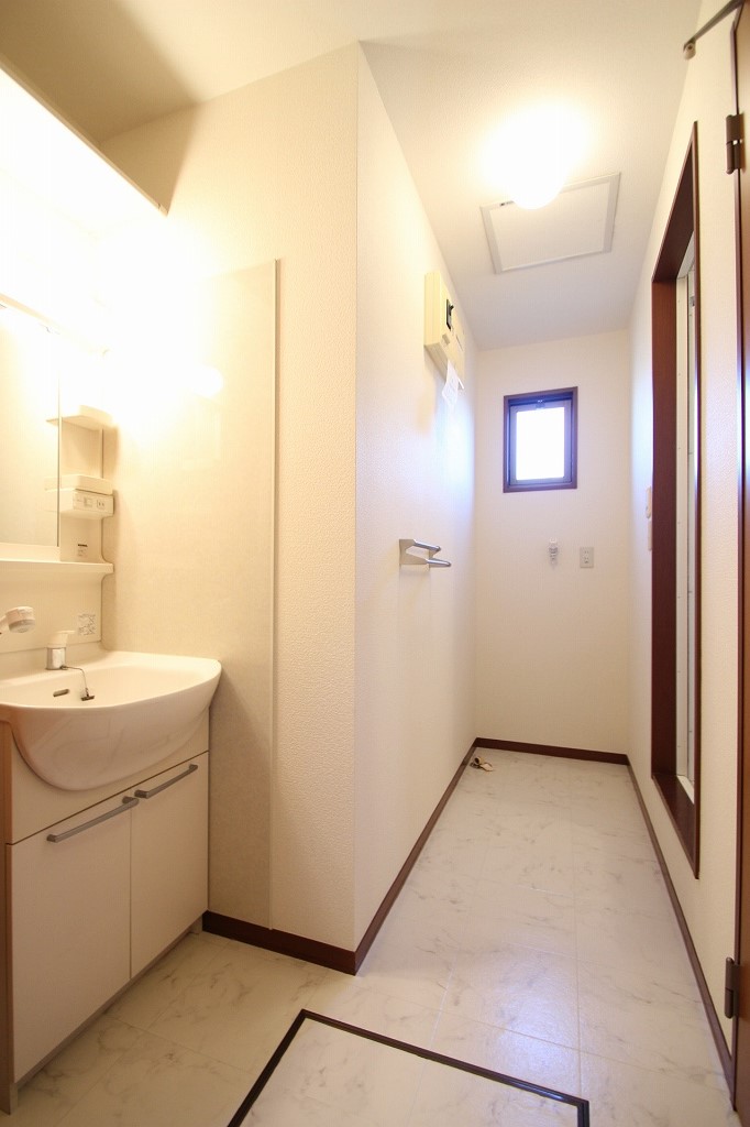 洗面所は広々としておりますして、浴室の物置きの部分はなんだか他の物件に比べ多い気がします。