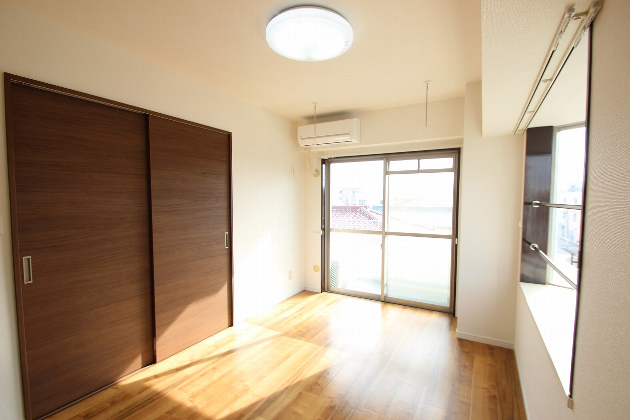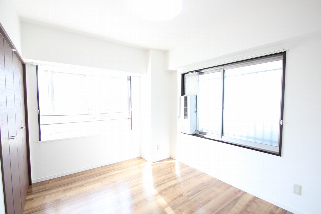 入って右手の6帖の洋室は北側のお部屋ではございますが、二面採光のため、日中は大分明るくなっております