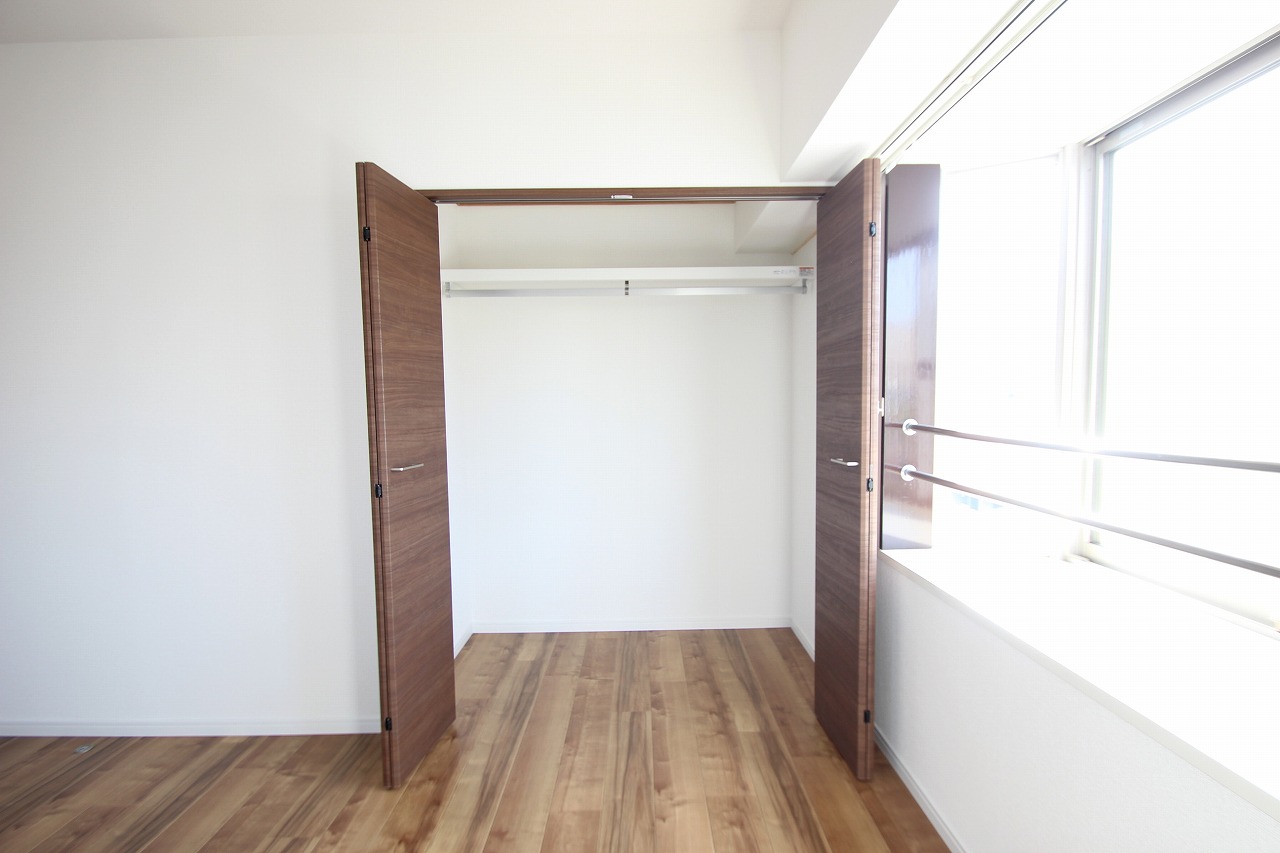 収納は↑のお写真のようなクローゼットとなっておりますのでコートを掛けたり、収納ケースを入れたりといろいろな活用ができるタイプの収納となっておりますよ