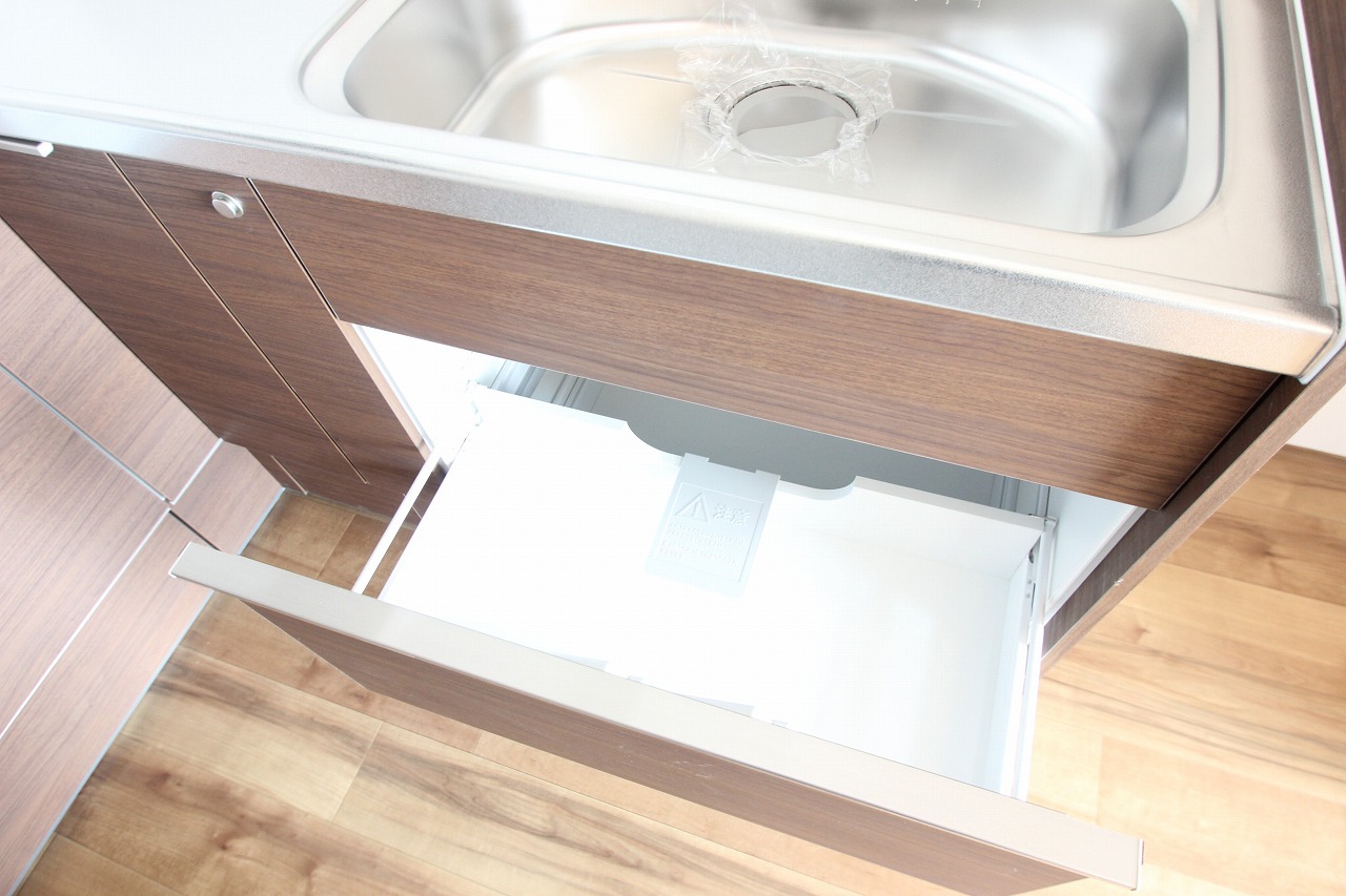キッチンはこんな感じで3口のシステムキッチンにグリル付きのものになっており、キッチン上下の収納についてはそこそこ量が入る仕様になっております