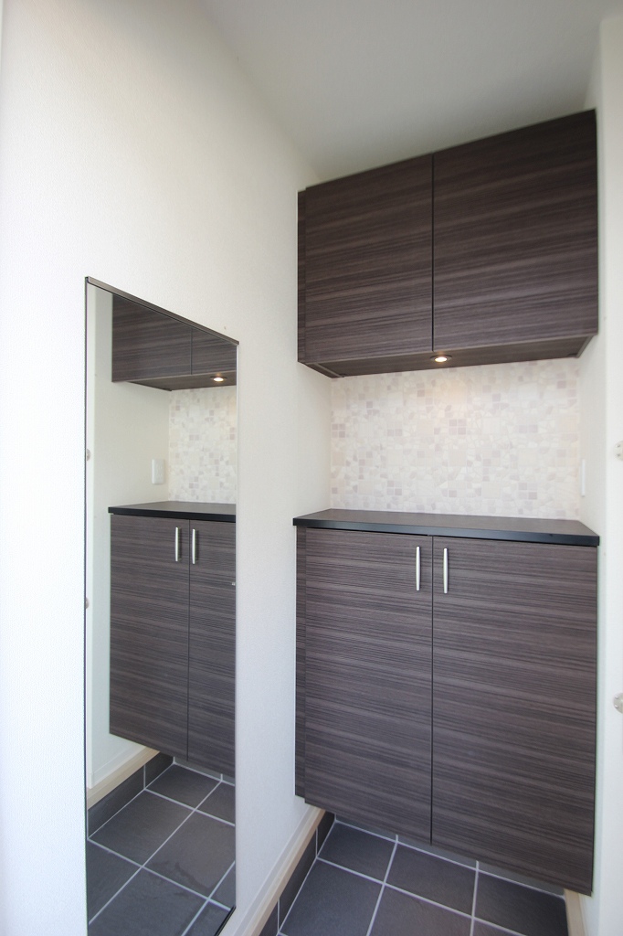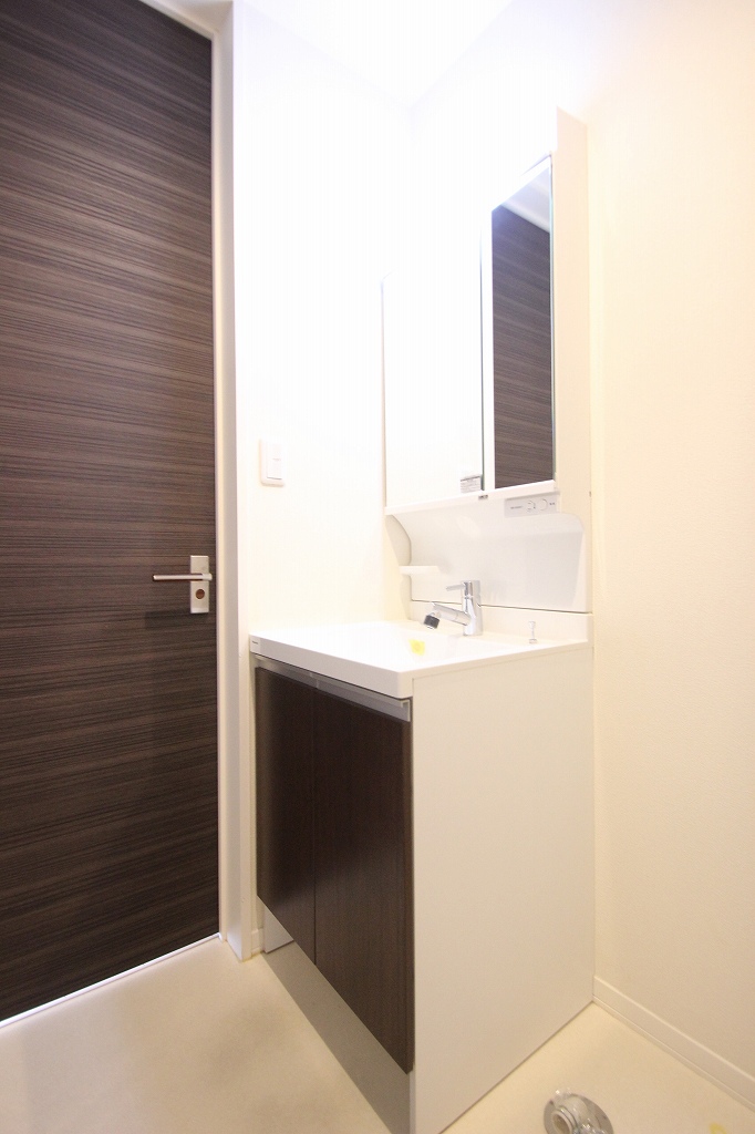 収納付きの脱衣所には2面鏡収納付きの洗面台!