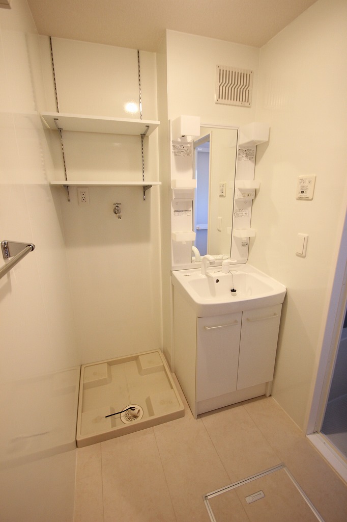 洗面所はこんな感じで備え付けの可動棚やシャンプードレッサー仕様の洗面台があるのが嬉しいポイントですね