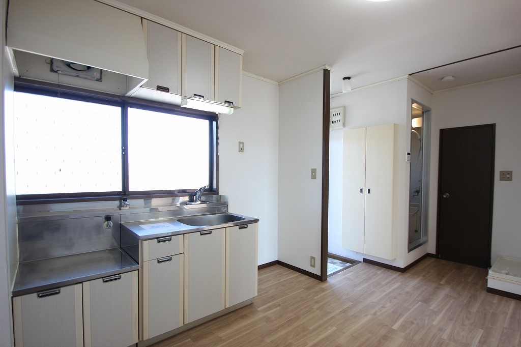 お部屋入ってすぐのDK部分はこんな感じでキッチンにも窓があるので明かりがついていなくても大分明るく感じますね