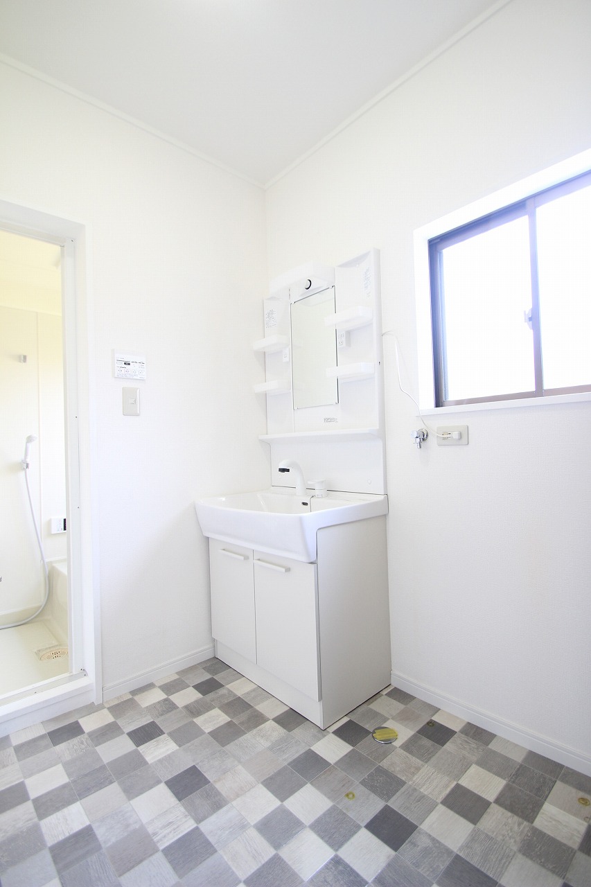 浴室手前の洗面所はかわいらしい色合いの内装にシャンプードレッサー仕様の洗面台になっております