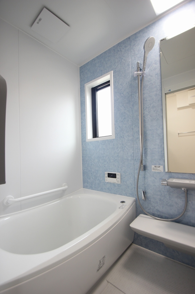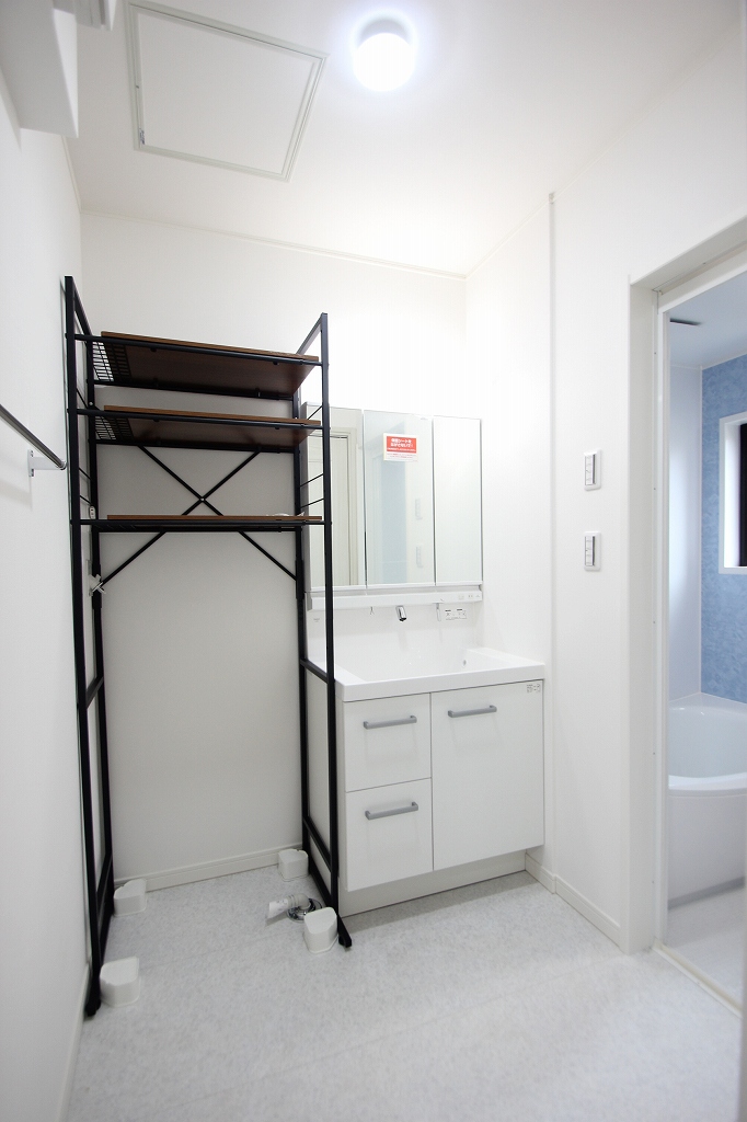 洗面所は、3面鏡の洗面台にタオルや洗剤が置けるラックはオーナー様が設置してくださいました!