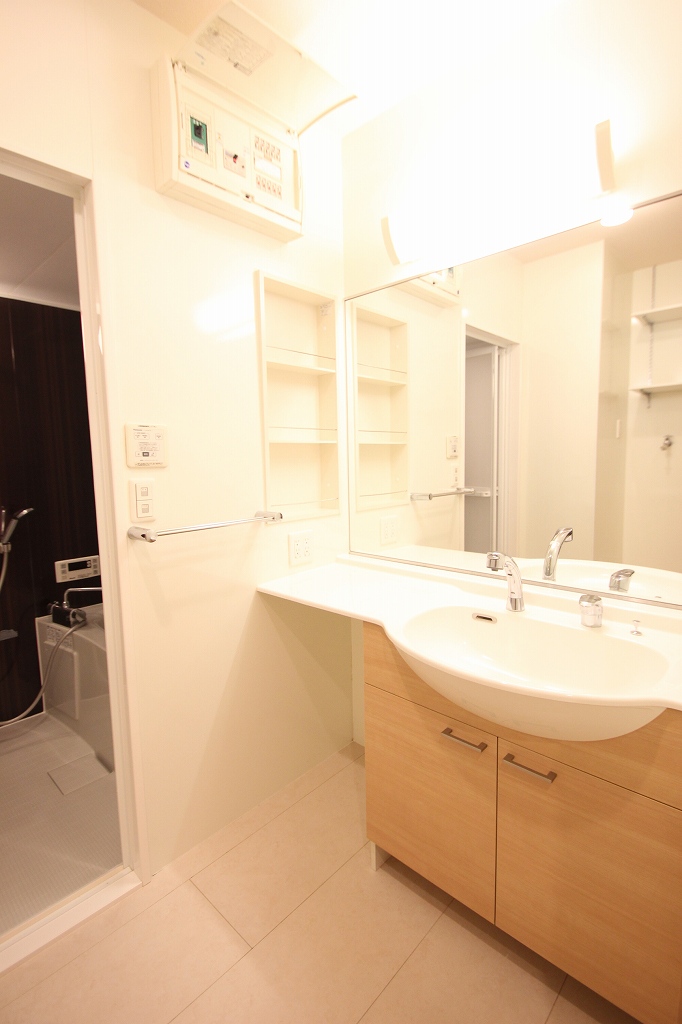 洗面所はこんな感じで大和リビング物件の特徴でもある広い洗面台が備え付けられております